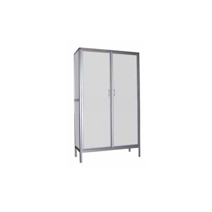Двухстворчатый шкаф с двумя металлическими дверками, внутри 4 полки металлические, замок.