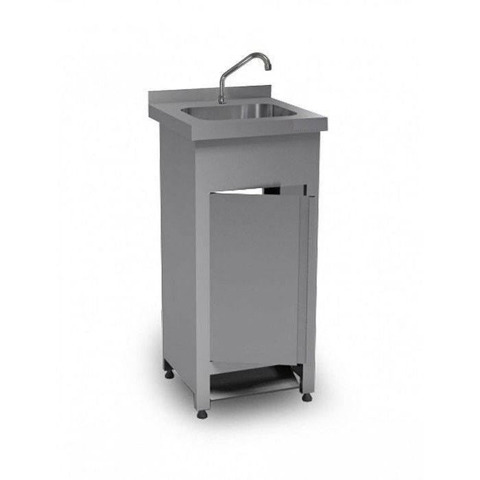 Напольный закрытый рукомойник из нержавеющей стали AISI 430 с одной распашной дверью, педальным механизмом, с бортом.