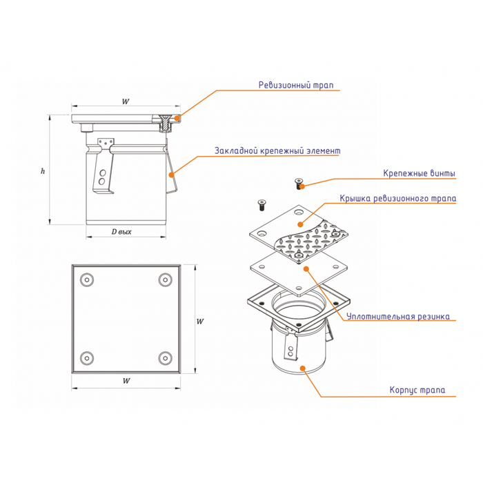 Трап-ревизия Rw200/110 производится из аустенитной нержавеющей стали марок AISI 304 или AISI 316. Имеет размеры 200х200 мм, высоту 120 мм, диаметр выпуска 110 мм.<br>