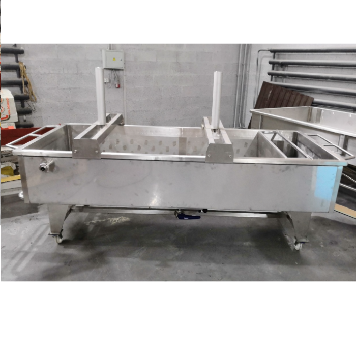 Предназначена для изготовления сыров и творога методом самопрессования, для подпрессовки и чеддеризации сырного пласта, для раскисания сырной массы для расстановки и заполнения сырных форм. Глубина ванны – 400 мм. Тележка для самопрессования состоит из следующих основных частей: - ванна; - тележки на колесном ходу; - фильтр плита на дно ванны (съемная); - фильтр плита верхняя прижимная; - фильтр плита буферной зоны (для регулировки высоты пласта); - 2 пневматических цилиндра, закрепленных на балках для подпрессовки пласта. Балки с цилиндрами подвижные – откатываются в сторону; - нож для резки сырного пласта.