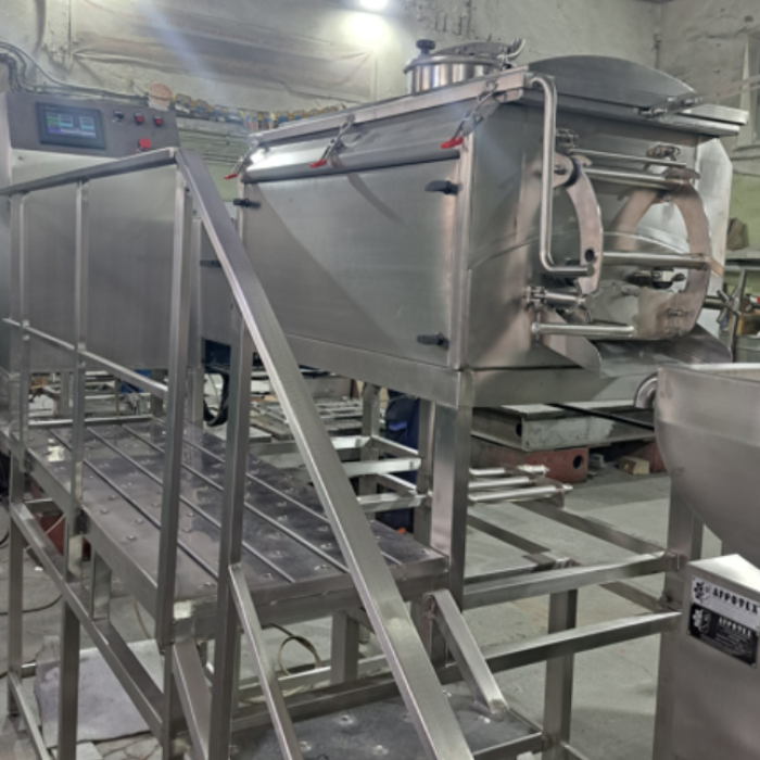 Предназначена для: - нагревания, перемешивания и растягивания сырной массы перед формованием сыров группы паста филата; - плавления и смешивания натуральных, аналоговых и имитационных сыров; - подачи пара в сырную массу; - загрузки / выгрузки в дальнейших тех. процесс. Технические характеристики: Максимальная загрузка – 500 л. Минимальная загрузка, л – 200. Высота подачи продукта – 1800 мм. Высота выгрузки – 1100 мм. Тип нагревателя – пар. Давление – 2 бар. Потребляемая мощность, кВт – 24. Принцип работы - Сырье загружается через верхнюю крышку (открывает всю рабочую область машины). Сырье не должно быть замороженным. После плавления готовый продукт выгружается из передней крышки машины при помощи шнеков, движущимся вперед. После этого готовый продукт выгружается в формовочную машину. ПРИМЕЧАНИЕ: 1. Парогенератор со стороны заказчика!!! 2. Очистка пара в стоимость не входит. В комплект поставки включен: 1. Площадка обслуживания к паровому плавителю V 1000 л. 2. Подъемник для сырья. 3. Комплект тележек (5 штук).