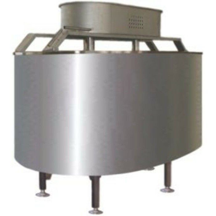 В сыродельных ваннах объемом 2,5 м3 и выше привод расположен сверху на опоре, а дно выполнено в форме конуса со смещенным центром, что обеспечивает полный слив продукта за короткое время.