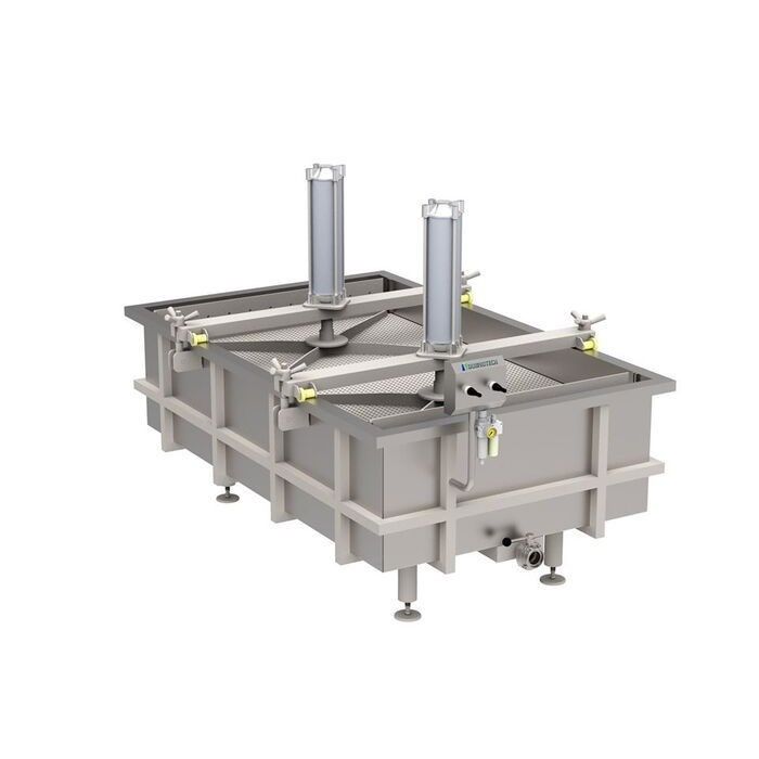 Конструкция включает в себя ванну, установленную на тележку, и пресс каркасной конструкции, оснащенный пневмоцилиндрами для тележки. По направляющим ванна подается к сыродельной ванне, заполняется и далее закатывается под пресс. После того, как будут выполнены отбор сыворотки и подпрессовка пласта, ванна выкатывается, а пласт вручную режется на бруски.