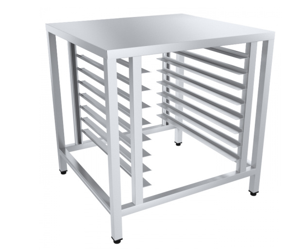 Подставка предназначена для установки пароконвектоматов. Оснащается универсальными направляющими под пекарские листы размером 600х400 мм и гастроемкости GN1/1. Изготавливается из нержавеющей стали, каркас сварной.