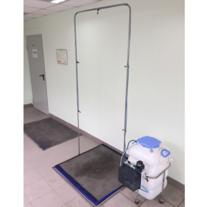 Рамка для дезинфекции предназначена для противовирусной обработки людей. Принцип действия: 1.Человек подходит к дезинфекционной рамке. Автоматически при помощи датчика движения включается распыление раствора в рамке. 2.Происходит обработка дезинфицирующим раствором при помощи мелкодисперсионных форсунок, которые расположены по всему периметру рамки. Дополнительно дезинфицируется обувь благодаря дезинфицирующему коврику. 3 Для более качественной дезинфекции, человеку зашедшему в рамку нужно сделать один оборот и выйти из рамки по направлению движения. 4.При прохождении человека через рамку дезинфекции уничтожаются вирусы и бактерии. 5. Система автоматически отключается при выходе человека из рамки.
