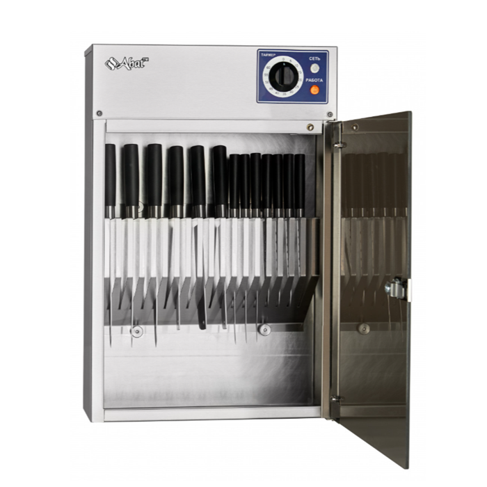 Стерилизатор ножей СТУ-1-18-02-1 производства Атеси (Россия) - стерилизатор кухонных ножей и иных инструментов в условиях заведений общепита, торговли и пищевой промышленности. Предусматривает настенное крепление. Обеззараживание производится ультрафиолетовым излучением.